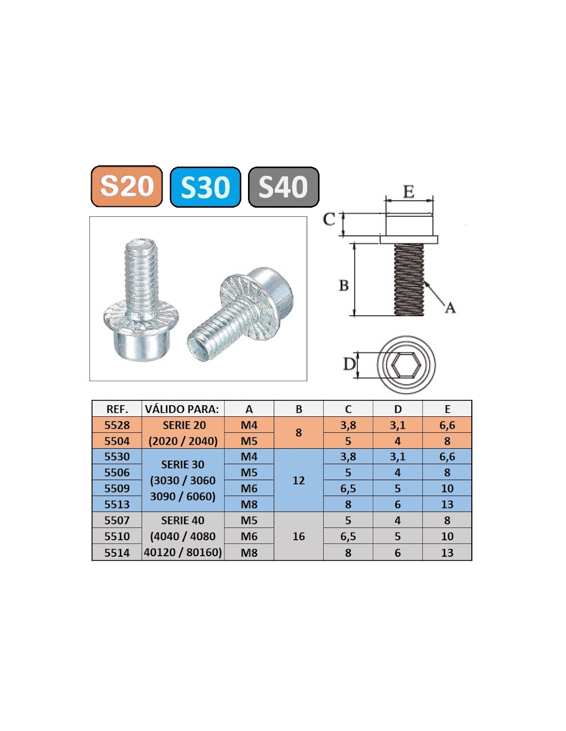 * Tornillo especial escuadras (base estriada).